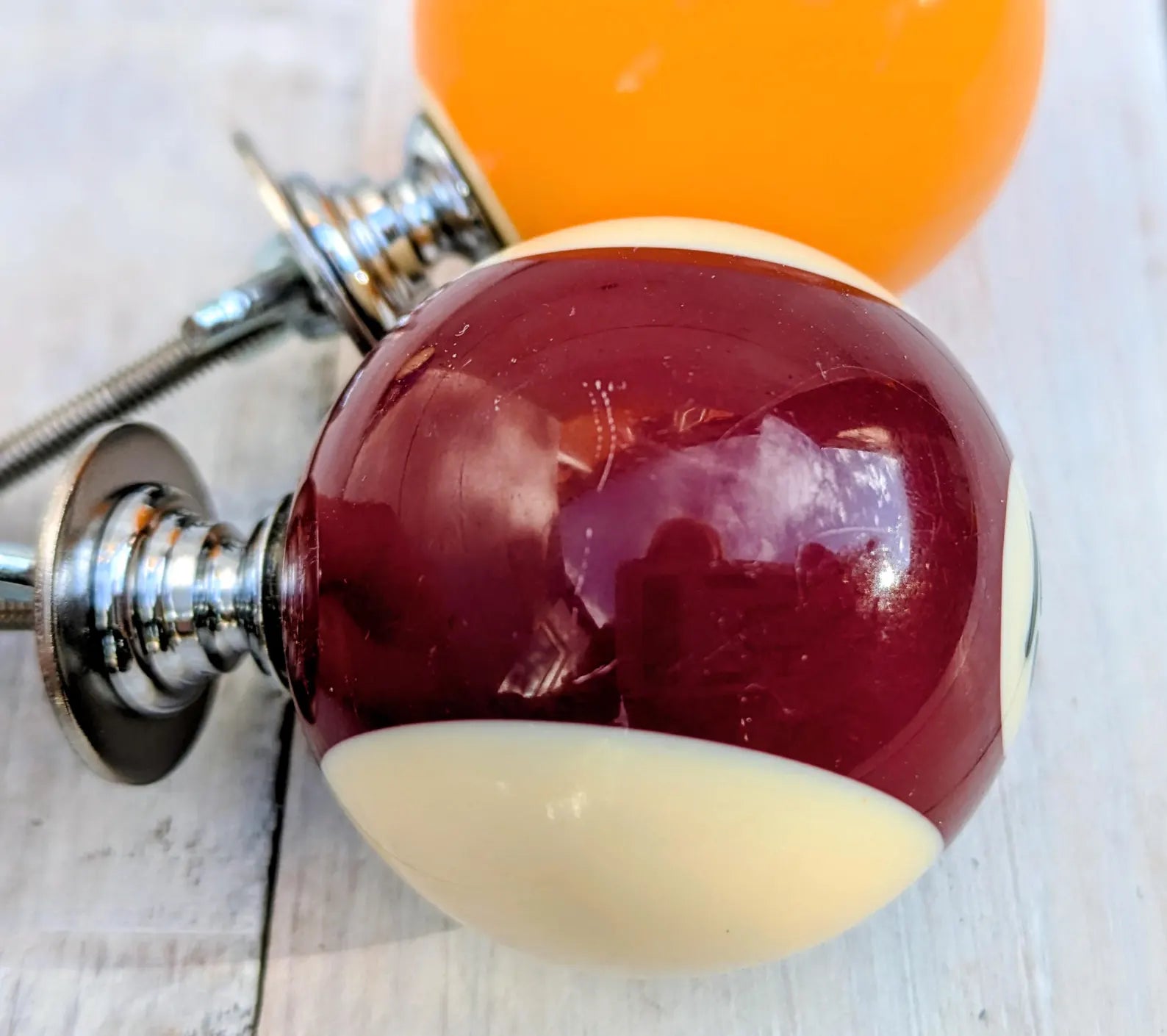 100% Handcrafted and Repurposed Pool Ball - Drawer / Cupboard Door Pull. Striking, colourful, original and hard wearing. They make turn boring old chest of drawers / Cupboard doors into a stunning piece of stand out furniture in the home - look great in Bedroom, Living Room, Mancave or kids bedroom.